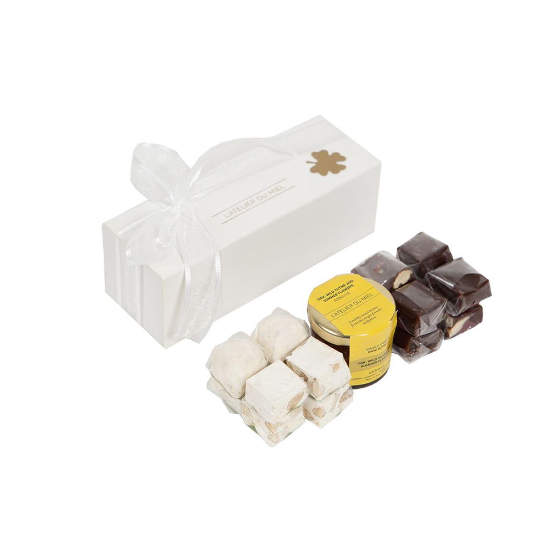 This set includes 30g honey jar + 35g black nougats + 35g white nougats in a carton box