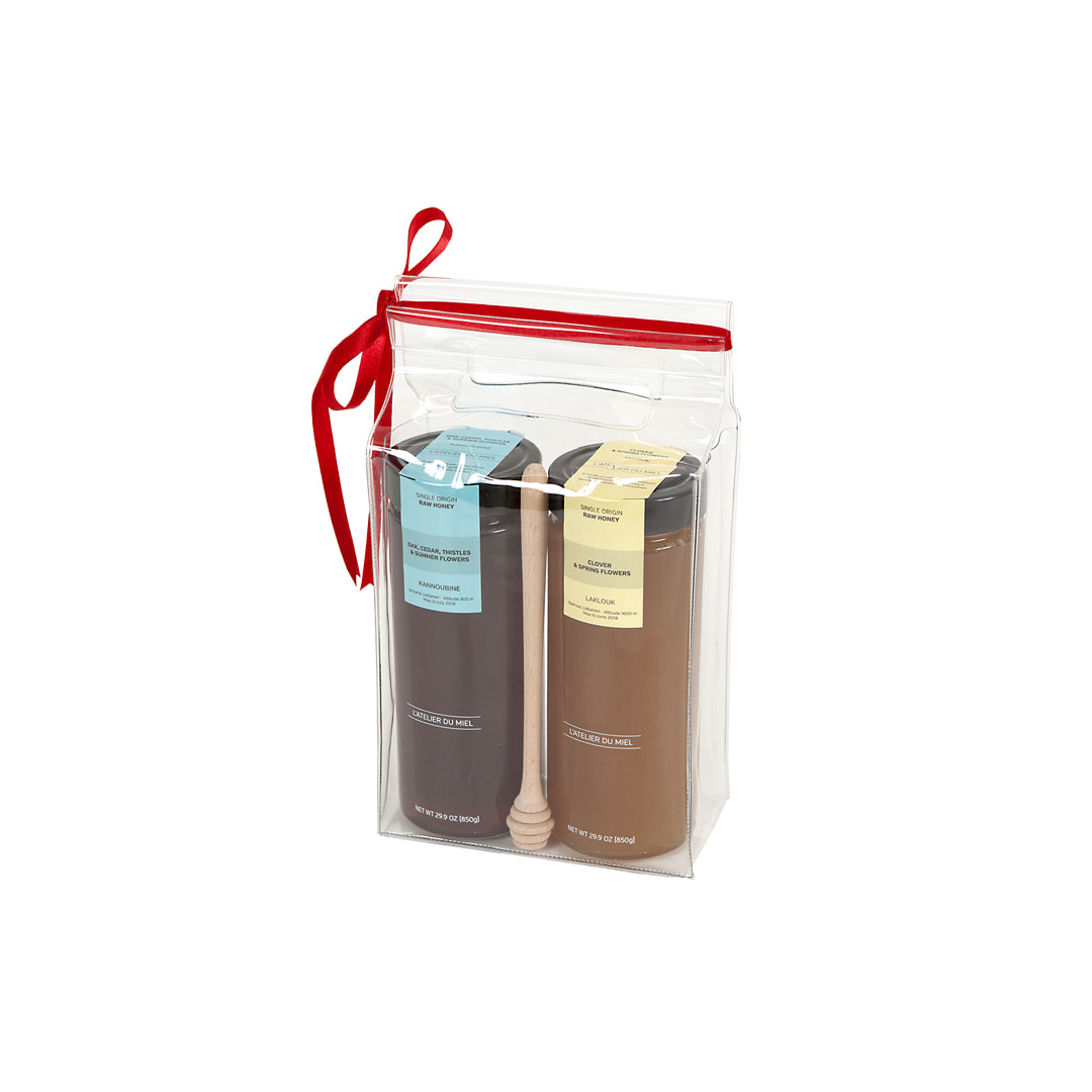 This set includes a PVC bag +2x850g honey jars + 1 Large wood dipper